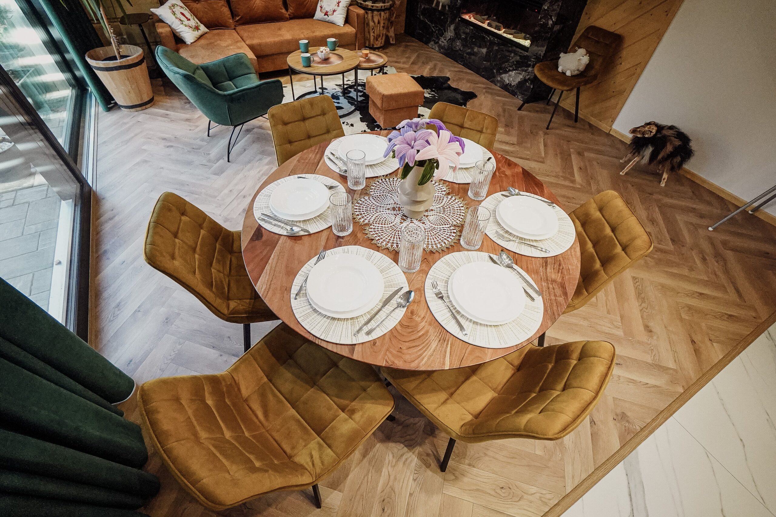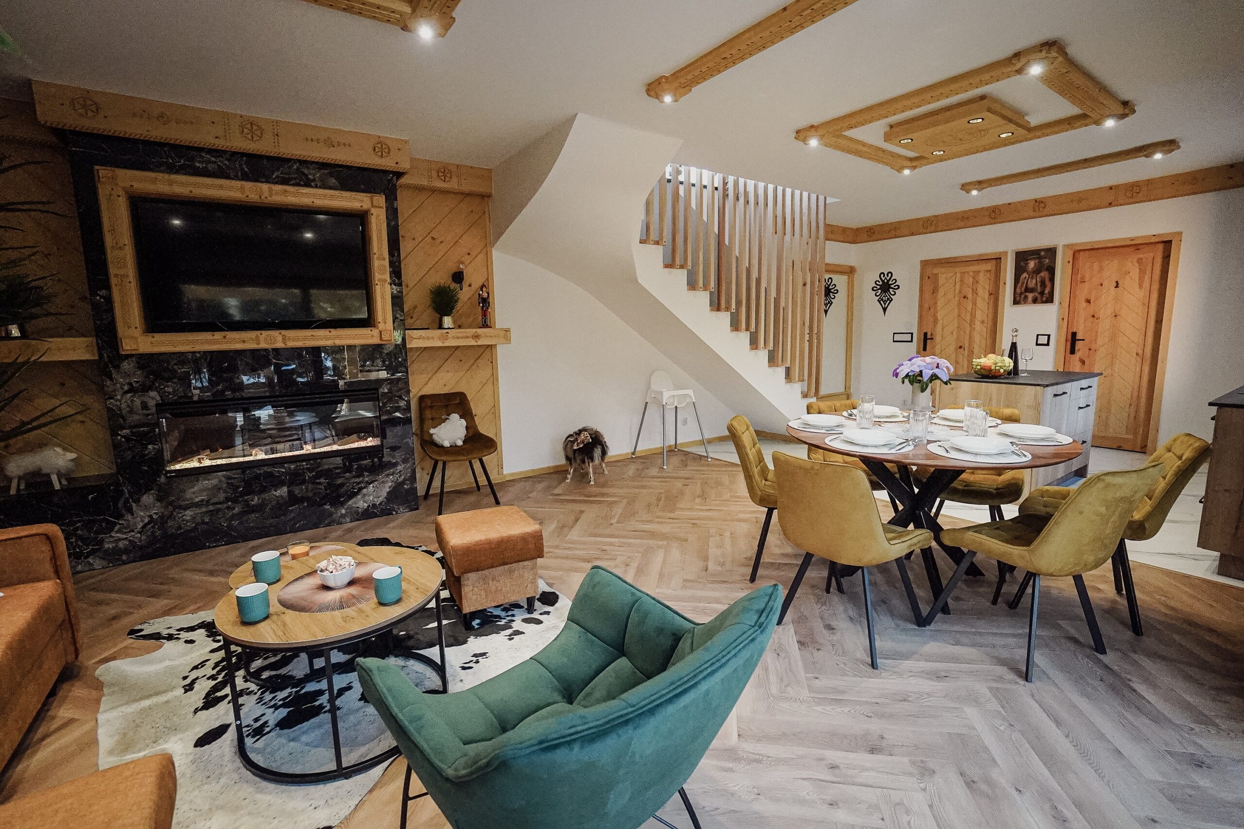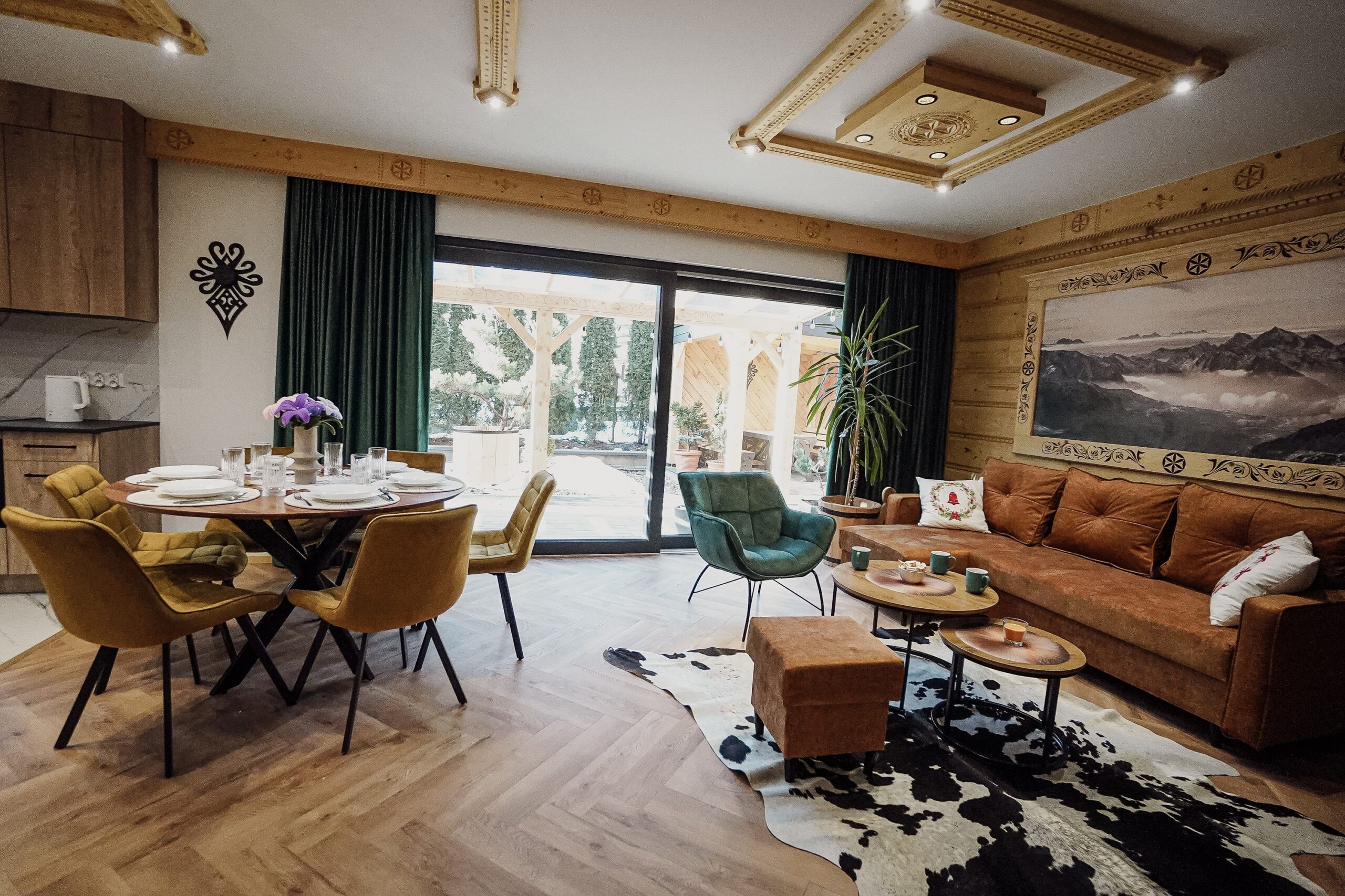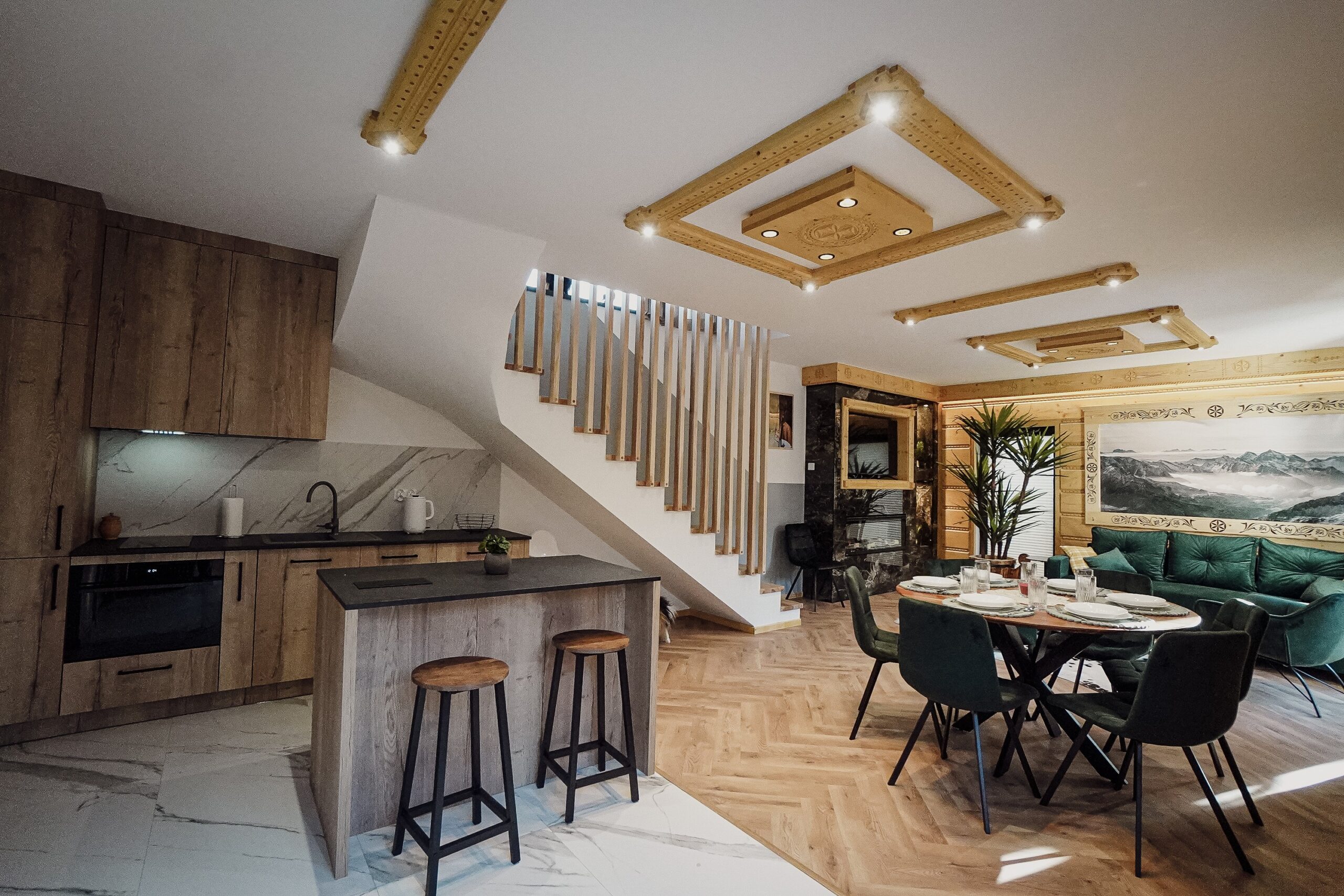 Nasze domki to połączenie nowoczesnego standardu z góralskim klimatem. W pełni wyposażona kuchnia, przestronny salon z TV 55” oraz dwie łazienki gwarantują wygodę przez cały pobyt.